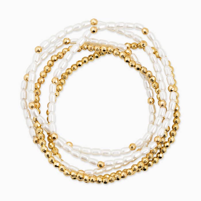 This gorgeous bracelet set offers three stretch bracelets featuring an acrylic pearl chain with gold ball bead accents and two gold bead stretch bracelets. A lightweight and fashionable bracelet set that will add a touch of elegance to any jewelry collection.
